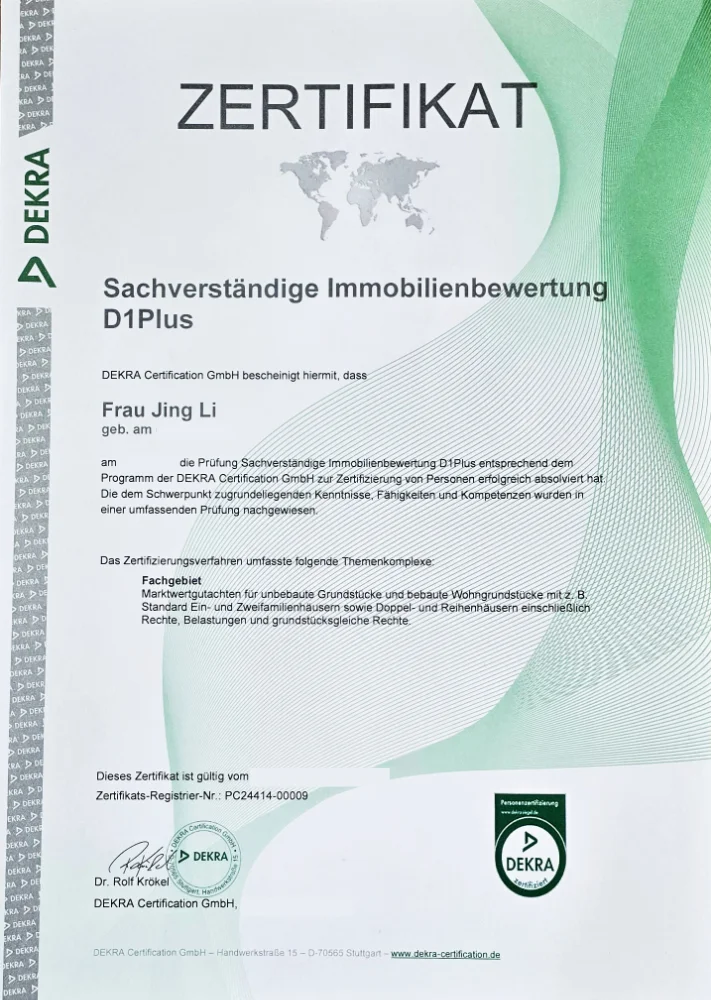 Als DEKRA-zertifizierte Immobilienwertermittlerin verfüge ich über die fachliche Grundlage, um Immobilien professionell, strukturiert und marktgerecht zu bewerten. Gerade im dynamischen Frankfurter Immobilienmarkt ist eine fundierte Immobilienbewertung in Frankfurt entscheidend, um realistische Preisziele festzulegen und Fehlentscheidungen zu vermeiden.